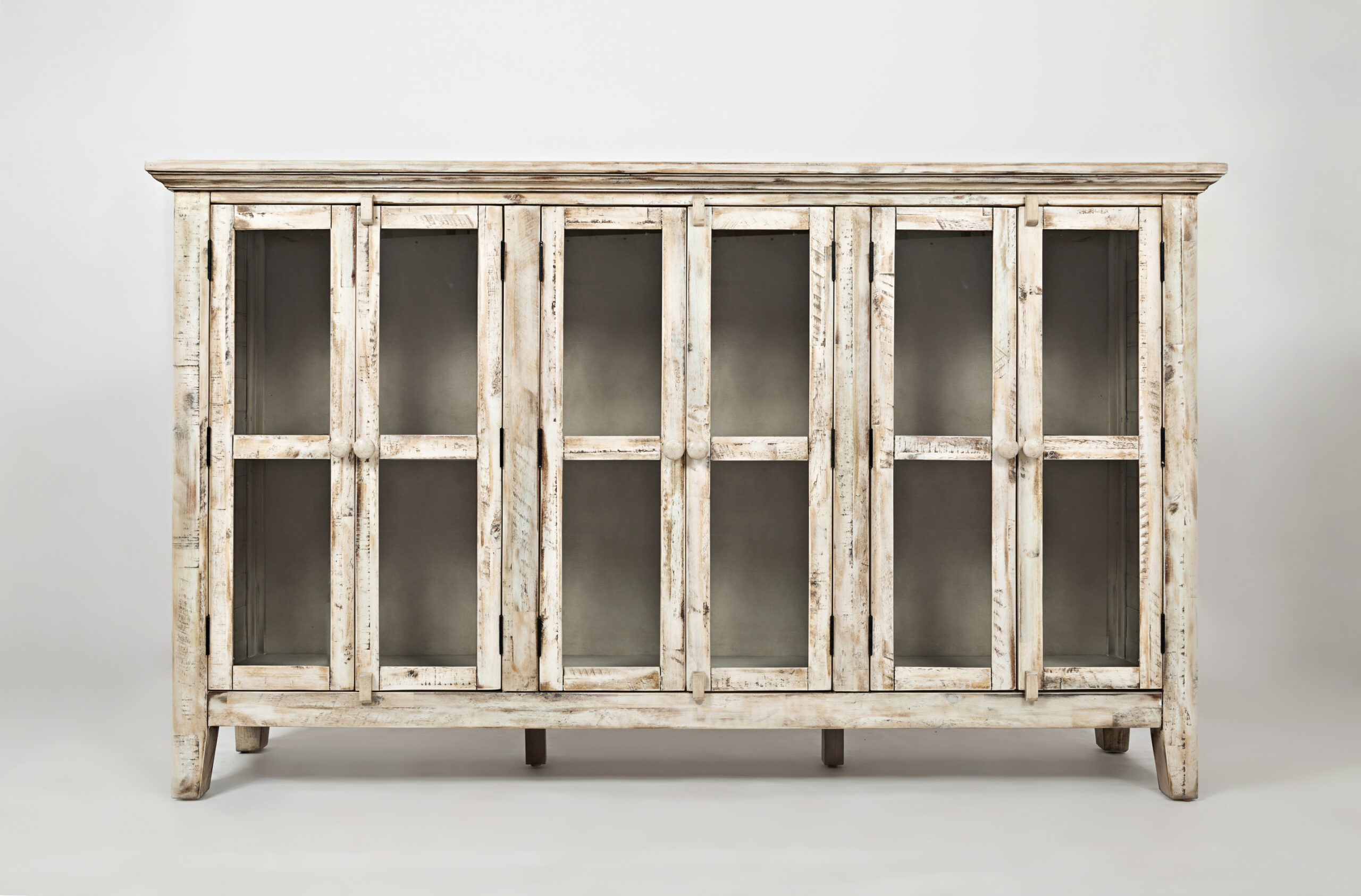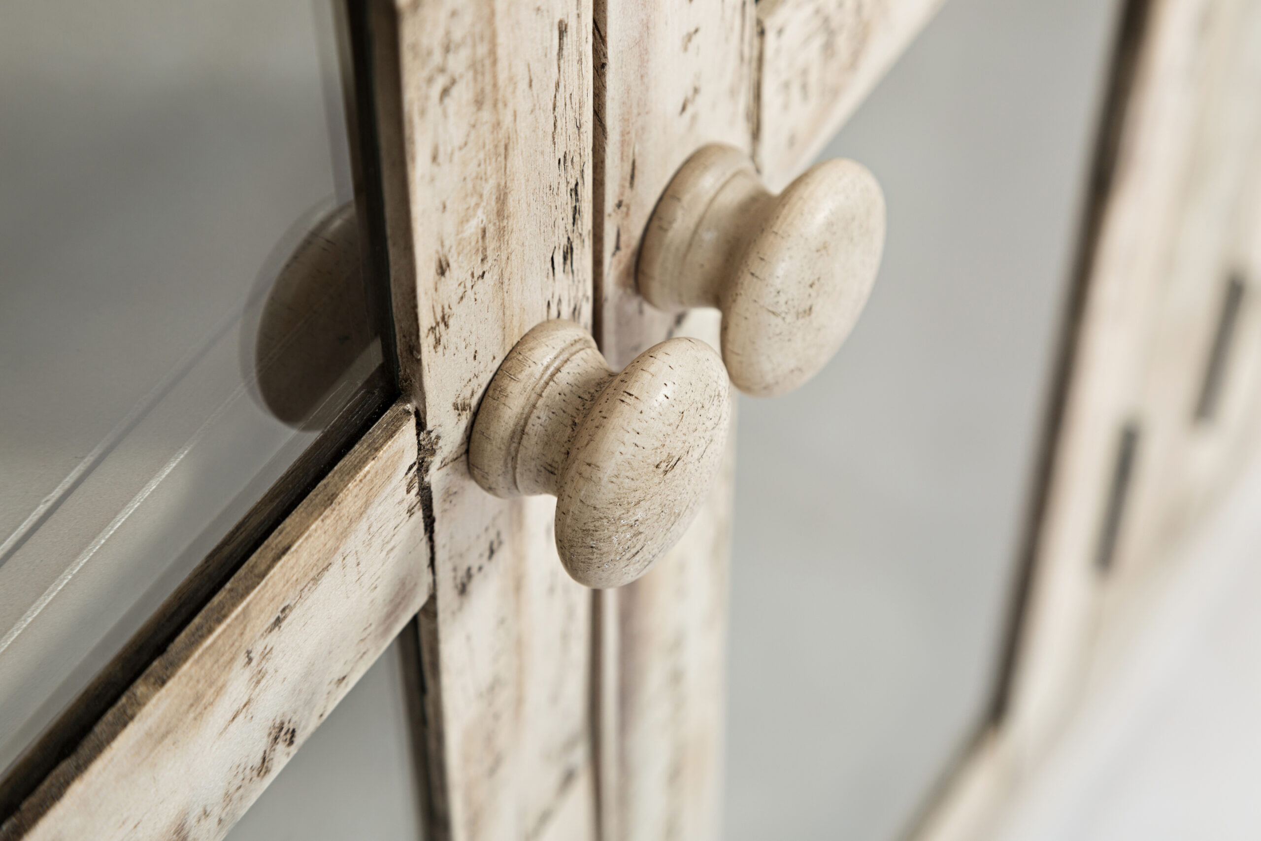 Komoda w stylu rustykalnym w kolorze kremowym z charakterystycznymi postarzeniami oraz ozdobnymi listewkami. Produkt posiada przeszklone drzwi oraz frezowany blat.
