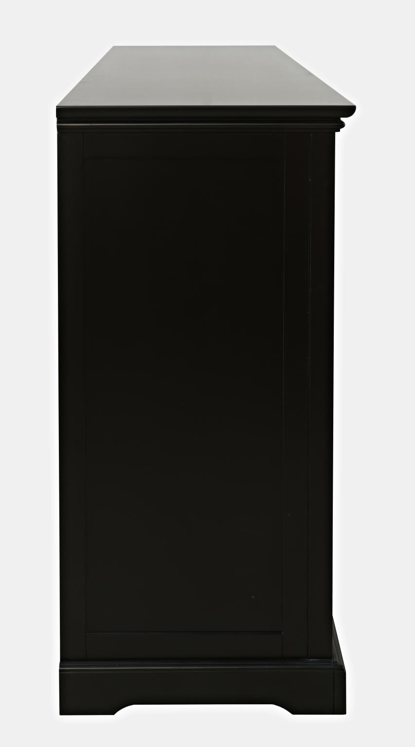 Komoda w kolorze czarnym, posiada czworo przeszklonych drzwi z ozdobnymi łukami oraz eleganckie podłużne uchwyty. Prosta forma przełamana jest frezowanymi krawędziami i widocznej strukturze forniru.