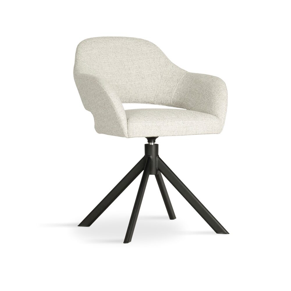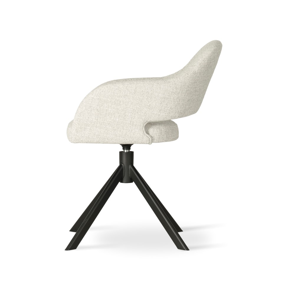 Obrotowa metalowa noga wprowadza nowoczesny akcent i funkcjonalność. Model sprawdzi się jako krzesło do jadalni, salonu lub biura. Możliwość wyboru tkaniny oraz koloru podstawy pozwala dopasować mebel do indywidualnej aranżacji wnętrza.