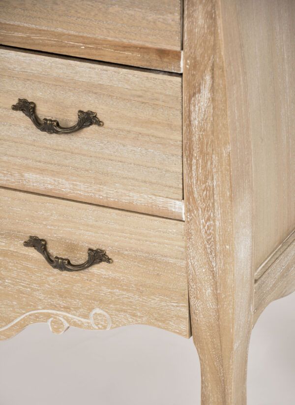 Komoda w kolorze jasnobrązowym na giętych nóżkach. Mebel wykonany jest ze szczotkowanego, bielonego drewna paulowni. Posiada przetarcia, rzeźbienia i ozdobne metalowe uchwyty.