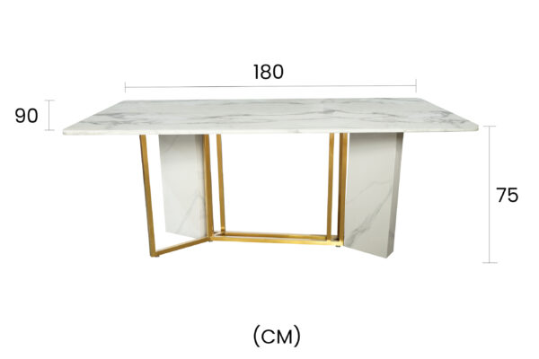 Stylowy stół o podstawie wykonanej z imitacji marmuru w kolorze białym i stali nierdzewnej szczotkowanej w kolorze złotym. Prostokątny blat w kolorze białym ma wzór imitujący marmur.
