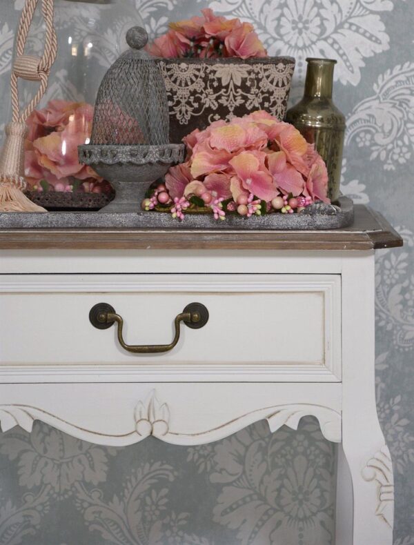Konsola w stylu prowansalskim z rzeźbieniami w kolorze białym z przecieranym, ciemnobrązowym blatem. Produkt posiada metalowe uchwyty i gięte nóżki.
