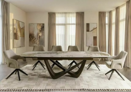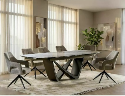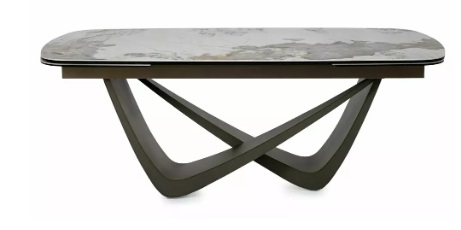 Stół rozkładany, blat: szkło hartowane + ceramika Pandoro, stelaż: metal, kolor: biały połysk / miedziany.